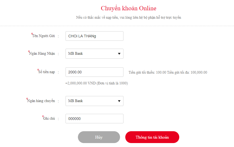 Điền thông tin đầy đủ và chính xác số tiền,ngân hàng nhận,ngân hàng chuyển,ghi chú sau đó bấm vào nút thông tin tài khoản màu đỏ là được.