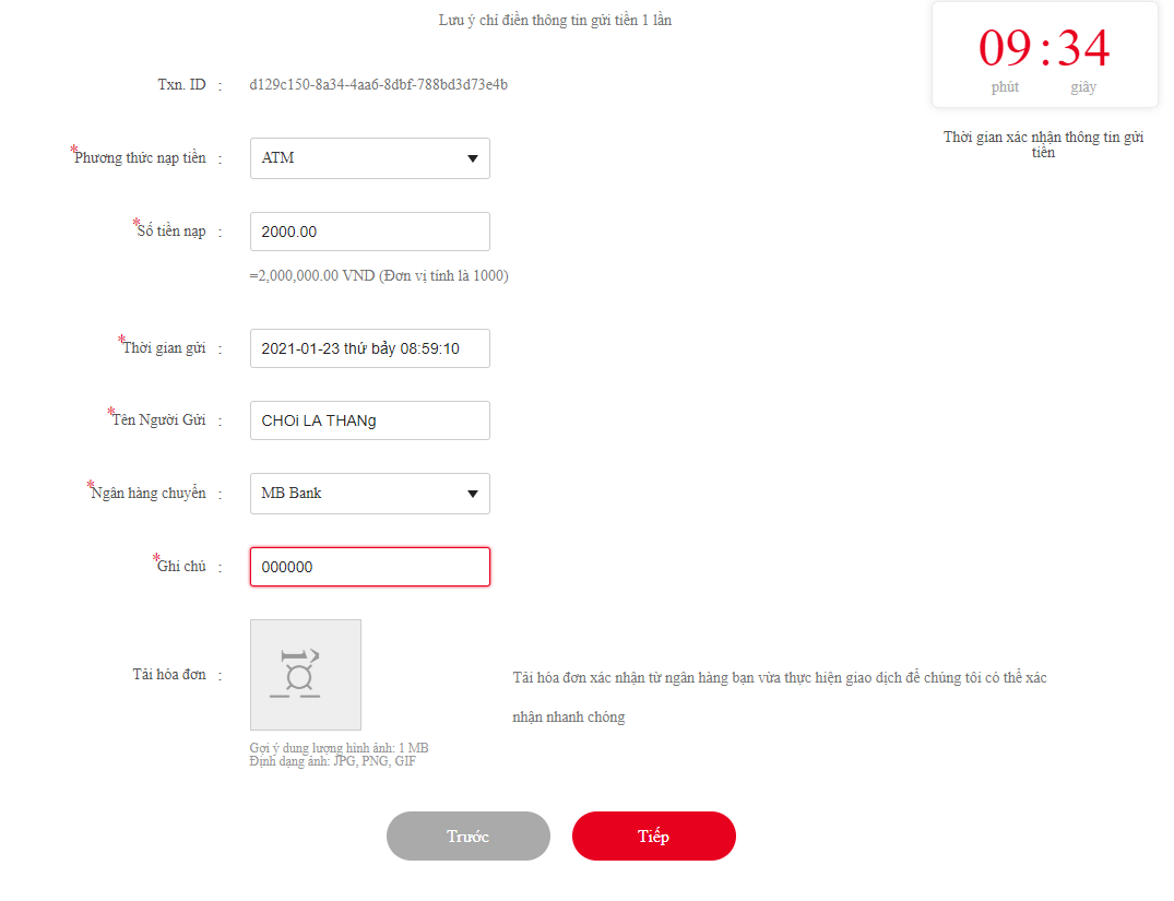 - Sau khi chuyển thành công, bạn nhấn vào ngân hàng đã chuyển, chọn tiếp tục và điền các thông tin yêu cầu để gửi lệnh nạp tiền, Sau đó chờ tài vụ cập nhật