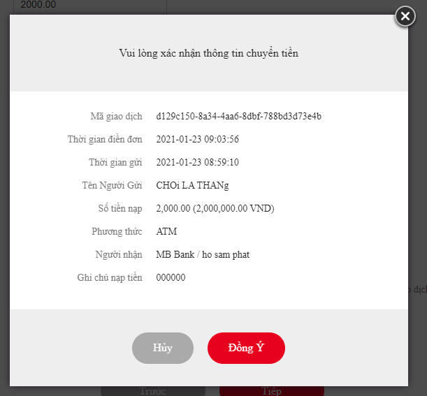 Bẫm vào nút Đồng Ý anh em đã thao tác gửi tiền thành công bằng phương thức ngân hàng địa phương Việt Nam.