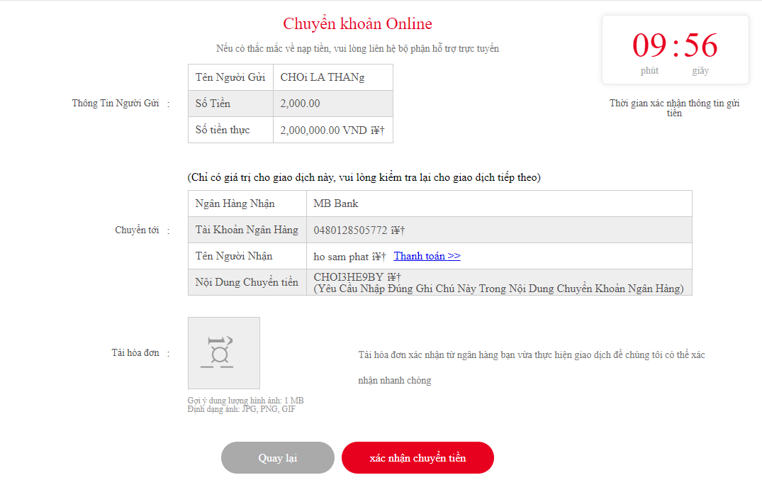 - Nếu chuyển khoản thành công không được cập nhật, Vui lòng liên hệ [ Hỗ trợ trực tuyến] để được hỗ trợ